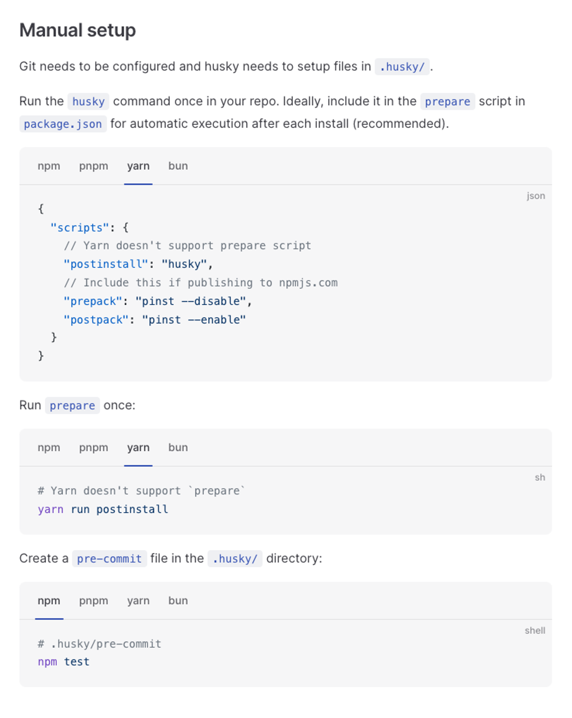 사용 전 주의사항 : husky를 설치하려는 프로젝트의 폴더 경로에 .git이 있어야 합니다. husky는 yarn으로 설치할때와 .git의 위치에 따라 설치 방법이 달라져서 조금 까다롭습니다.